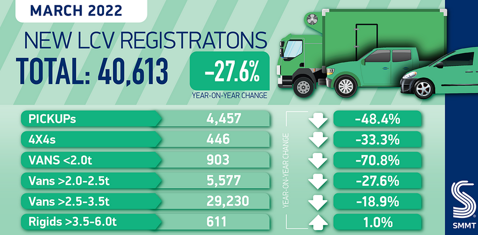 根据汽车制造商和贸易商协会(SMMT)发布的最新数据,3月份英国轻型商用车(LCV)市场下降了27.6%,达到40613辆。与去年3月相比,下降的幅度更大,当时被压抑的需求促成了自1999年以来LCV注册量的最大增幅。
