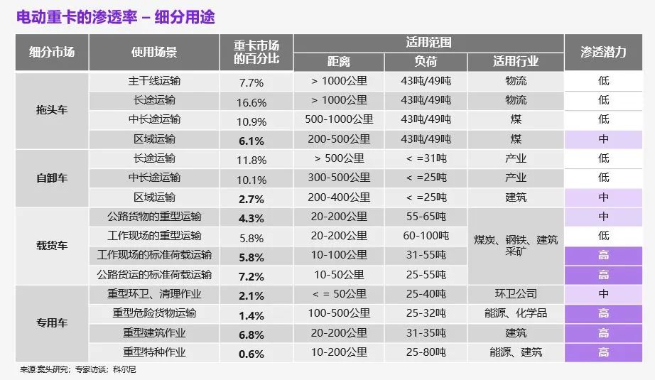 电动化是全球科技和社会经济发展的必然趋势,是我国实现 “碳达峰、碳中和” 目标的重要抓手,是汽车行业减碳、减排的强大驱动力,也是我国汽车企业发展的核心战略方向之一。 与此同时,电动重卡的总拥有成本持续降低,未来将相对燃油重卡形成明显优势,为其长期市场需求奠定坚实基础。政策激励、创新商业模式的逐步完善等因素也将共同助力电动重卡的推广与普及。现阶段,在高频启停的短距离运输(“短倒”)核心应用场景,电动重卡,尤其是换电重卡已然异军突起。 可以预见的是,伴随技术路线与基础设施的持续完善,电动重卡的使用场景将大幅拓宽,行业将迎来重要发展风口,后期市场竞争也将更为激烈。 科尔尼认为,截至 2030 年,中国市场的电动重卡将实现 18% 的渗透率,并在大多数运营场景下实现对于燃油车的显著经济性优势。 一、外部要求:脱碳的紧迫性 放眼全球,中国是首批积极制定碳减排目标的国家之一。 2020 年 9 月 22 日,中国国家主席习近平在第七十五届联合国大会一般性辩论上正式对外宣布:“中国将提高国家自主贡献力度,采取更加有力的政策和措施,二氧化碳排放力争于 2030 年前达到峰值,努力争取 2060 年前实现碳中和。” 在此之前,中国汽车行业也设定了二氧化碳减排目标:第一阶段(2012-2019 年)目标在 2012 年的基础上减少 15% 碳排放,第二阶段(2020-2030 年)目标再降低 10% 碳排放。这一减碳目标与欧美国家极为接近,并远超同为亚洲碳排放大国的印度。 在减碳目标的要求下,作为中国交通领域公认的大气治污重点对象,重卡推进节能减碳愈发刻不容缓。 数据显示,虽然重卡仅占中国汽车保有量的 2.2%,但其氮氧化物和颗粒物排放量分别占汽车总排放的 85% 和 65%。这与重卡的载重大、油耗高、行驶路程长等紧密相关。与轻型商用车相比,重卡的平均负载增加 2900%,最大总重量增加 1043%,百公里平均油耗增加 275%,平均距离增加 300%。 要减少重卡的碳排放,电动化是一个必然途径。科尔尼认为,电动化是实现重卡脱碳目标最可行的一种手段,也是中国实现 “双碳” 目标的一个重要突破口。 二、增长驱动:多重作用 在中国,重卡电动化目前仍处于起步阶段,渗透率不足 1%。 但是,从绝对增速的角度来看,电动重卡已然占据中国重卡市场绝对增长的主要部分。未来,电动重卡还将从政策激励、总拥有成本优势、成熟的商业模式、持续的市场需求等诸多有利因素中受益,维持高速增长态势。 1. 政策激励 目前,中央和地方两级针对电动重卡的有利政策逐步落地。这些政策包括受碳减排驱动的环境影响评价、直接购买补贴、道路通行特权、地方能源补贴、以及鼓励建设相关基础设施等。 其中,环境影响评价的影响显著。从 2021 年起,包括河北省在内的 7 个省份基于生产过程中的碳排放量对钢铁、电力、建材、有色金属、化工、石化等行业开展环境影响评价,由于环评达标结果和相关行业产能紧密相关,此将促进相关行业企业置换电动重卡以降低碳排放。 道路通行特权方面,郑州、长沙等地都对燃油重卡和液化天然气重卡在货运类型、工作时间或区域方面进行限制,因此也会倒逼终端用户更加倾向于选择电动重卡以提高运营效率、增加总体收入。 2. 总拥有成本较低 截至 2020 年,只有在用电成本明显低于柴油成本的地区,电动重卡才能实现盈亏平衡。但是未来几年内,重卡通过能源替换或可进一步节省运营费用。 科尔尼预计,考虑到最近的油价高涨,如果电动重卡使用非高峰时段、更便宜的电力,能源成本最多可节省近 60%。这还不包括采用换电模式所带来的购置成本降低和由于不用担心电池衰减所造成的折旧成本降低。 截至 2030 年,由于电池及其它原材料成本的下降,电动重卡的购置成本将进一步下降;通过 BMS(电池管理系统)的改进,电动重卡的百公里耗电量将进一步降低;此外,随着充换电站运营效率的提高和商业模式的成熟(如储能、电池回收),充换电服务费将进一步下降。这些成本的下降将进一步降低用户的总拥有成本。 科尔尼认为,截至 2030 年,中国市场的电动重卡在大多数运营场景下的经济性将较当前燃油车水平有大幅提升(如图 1)。为电动重卡的长期市场需求奠定坚实基础。 图 1:电动重卡与柴油重卡的总拥有成本比较(2020-2030 年) 3. 愈发成熟的商业模式 电动重卡进一步增长的潜力还来自于供应端愈发成熟的商业模式和销售服务方案。 基于更准确的客户需求分析,重卡制造商的销售策略也日趋成熟。其一,重卡制造商为销售团队提供越来越定制化的销售策略。例如,某公司强调燃油车或将持续遭遇监管的潜在风险,进而将其电动车产品定位为 “一站式” 的无忧购物。其二,重卡制造商不断加大对电动重卡的销售支持力度。例如,除了更高的销售返利外,某公司还为电动重卡客户提供更长的保修期和一对一的 7×24 服务,以赢得更多的客户。其三,重卡制造商也在积极进行一些商业模式层面的探索,如将电动重卡产品与服务捆绑销售,和第三方合作投资或运营充换电站,并推出更多相关的金融产品。 4. 持续的市场需求 从使用场景来看,与燃油重卡等车型的长途运输相反,需要高频启停的短距离运输(“短倒”)场景,如港口、矿山、大型钢厂、园区和城市渣土运输等,被认为是电动重卡最好的应用场景。在这些场景中,电动重卡可以轻松
