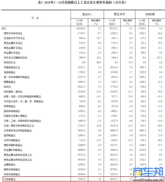 12月27日,国家统计局公布,1-11月,全国规模以上工业企业实现利润总额57445.0亿元,同比增长2.4%,增速比1-10月提高1.7个百分点。在41个工业大类行业中,25个行业利润总额同比增加,15个行业减少,1个行业持平;其中,汽车制造业前11月利润总额达4781.1亿元,增长7.2%。